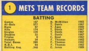 And when you’re a seven-year-old kid eight years later and you turn over Topps Card No. 1 for 1970, the team picture card labeled WORLD CHAMPIONS on the front, and scan the Mets’ various single-season records through 1969, you learn that F. Thomas and his 34 home runs are still the most home runs any Met has ever hit in one year, you can’t imagine any record any bigger within the realm of the team you have chosen as your own. No, you think to yourself, these Mets, defending WORLD CHAMPIONS or not, don’t really hit home runs. They wouldn’t in 1970 or 1971 or for a few more years and you just assumed Frank Thomas’s 34 from 1962 were unassailable. You knew Maris once hit 61 for the Yankees. You knew that a Willie Stargell might pound 48 for the Pirates or Johnny Bench might go deep 45 times for the Big Red Machine. You also knew no Met had ever hit more than 34 and took it on faith no Met might ever hit more than 34. You were OK with this because it was on the back of that baseball card. It was just a fact, and as facts went in a kid’s mind, it was king-size.