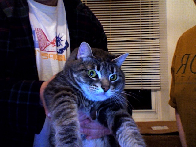 Does not our eldest cat look thrilled? We were trying out the various bells and whistles on our new Mac the other night and H-Dawg was handy for a screen test. I can’t explain why he (and our t-shirts) are backwards but it doesn’t matter. Hosmer is preternaturally cute, especially when lying upside down.