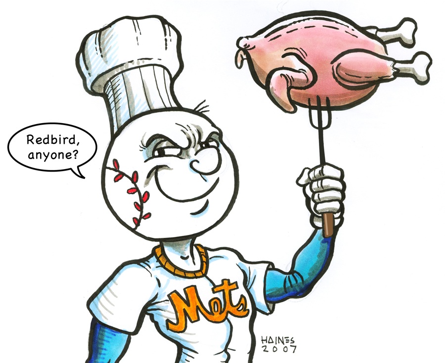 Mr. Met has skewered himself a Cardinal. Dig in everybody!