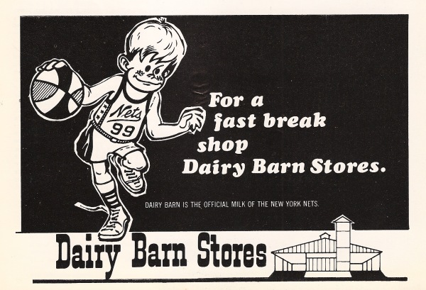 | Two pillars of Long Island life in the 1970s were the ABA’s New York Nets and our very own Dairy Barn. Once in a while, they came together for a late-night quart of milk. The ABA is history and the Nets are elsewhere, but you can still drive through 48 Dairy Barns on our otherwise uncivilized island. |