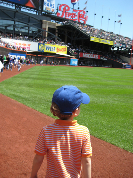 Snapped by his mom on Mother’s Day, while I watched from the Excelsior level very far away and cheered on my two beloved little dots. Careful, kid — linger out there in left field too long and you might find yourself at first base with a borrowed glove.