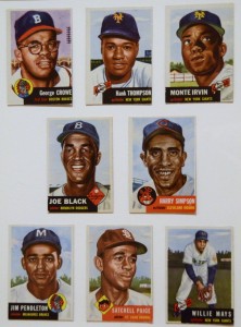 The Metropolitan Museum of Art dipped into its legendary Burdick Collection [2] and set up an exhibit devoted to those ballplayers responsible for Breaking the Color Barrier in Major League Baseball [3]. It takes up but a veritable speck of space inside an immense cathedral, but what it features is larger than life: Willie Mays, Hank Aaron, Jackie Robinson, Satchel Paige and dozens of other greats in their late 1940s Bowman and early 1950s Topps best, streaming ahead in time to future Met Pumpsie Green [4], pictured as a 1961 Red Sock. (Boston was the last team to integrate, in 1959, thus his inclusion among the immortals.)
