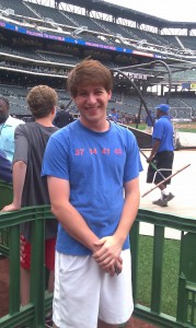 Stephanie and I have enjoyed telling people we know Ryder Chasin since the day we met him at his Bar Mitzvah in the fall of 2009. If that sounds like an unusual place to meet somebody for the first time, Ryder was no ordinary Bar Mitzvah boy and the site for the celebration of his “becoming a man” not the kind of place where you’d necessarily figure on being any time of year, let alone a windswept November afternoon. That story is here [2], but I’m happy to report it merely serves as prelude to further chapters of our story together, the latest of them unfolding last Tuesday night at Citi Field — which included some time on the field with Ryder and his dad, Rob. Rob, it happens, knows somebody who knows somebody and…well, we took in batting practice from our own little barricaded alcove (SAT word!); sat in some incredibly close and cushy seats; enjoyed unusually personal attention from the Mets (including two autographs for Ryder from actual Mets Jordany Valdespin and Justin Turner); discovered what the little-known Payson entrance [3] is for (consider it the Citi Field equivalent of Henry Hill’s Copacabana shortcut [4] through the kitchen in GoodFellas); were directed to a complimentary pregame buffet; and watched our favorite team look typically horrible [5] in losing to the Rockies.