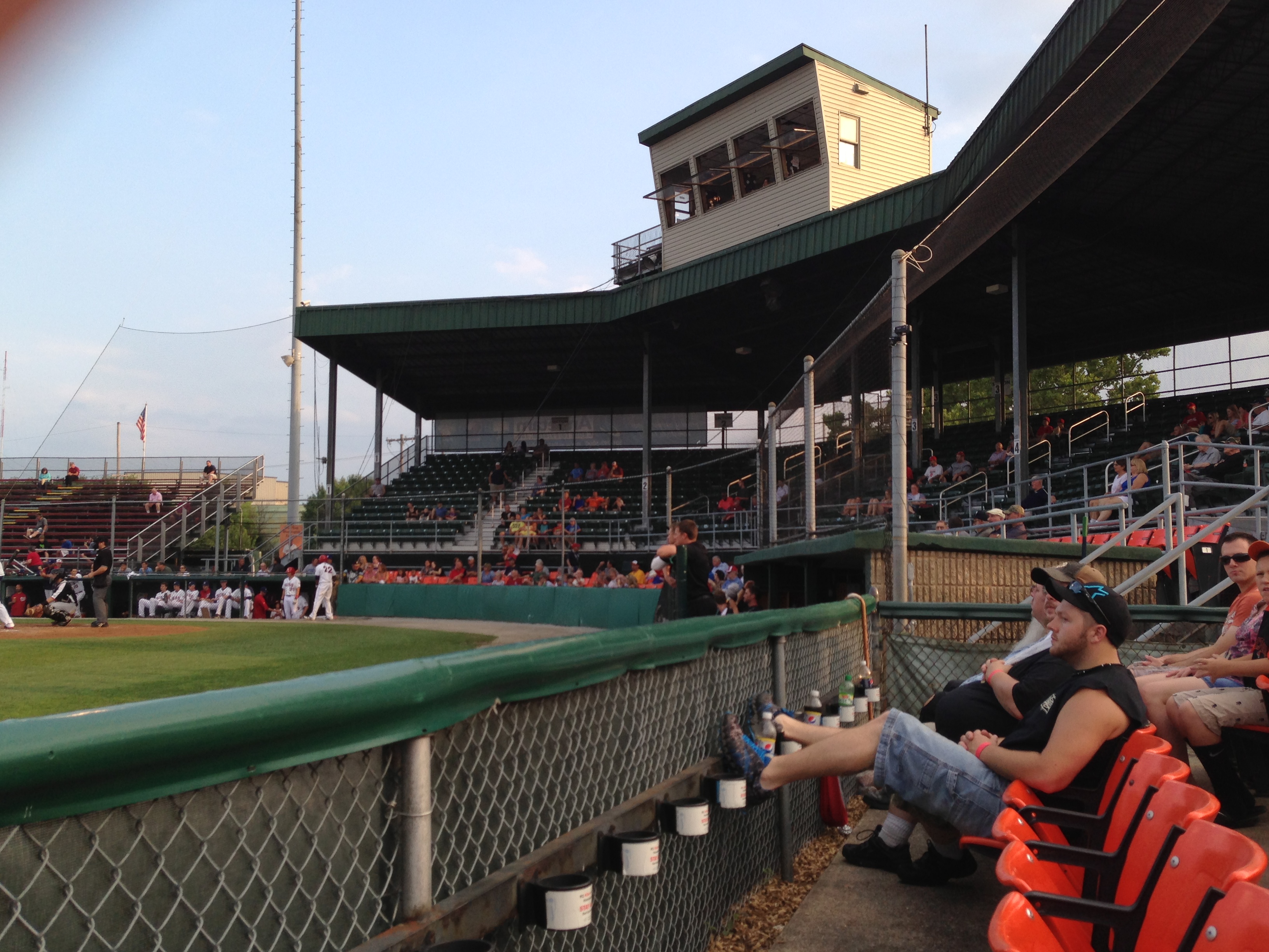 Funkstown is also a mile from the home of the Hagerstown Suns. So having paid my respects, off I went for the very short drive to Municipal Stadium. Tuesday’s a discount night, so I could choose between a general-admission ticket for $4 or a front-row seat for $7. I sprang for the expensive seat, and paid $9 for 32 ounces of pretty decent beer, which left me thinking that Hagerstown was pretty much all right.