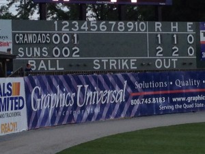 [6]The Suns’ manager is Tripp Keister [7], who was drafted by the Mets back in ’92 and spent four years in their system, with teammates including Edgardo Alfonzo, Rey Ordonez, Bill Pulsipher, Jason Isringhausen and Paul Wilson. Keister made it to Binghamton before hanging it up. I didn’t remember him, but the name of the Crawdads’ manager was familiar. I tried to figure out what team Corey Ragsdale had played for, imagining him as a utility guy for the Rangers or the White Sox. Which was wrong — I was thinking too far afield. Ragsdale, as it turned out [8], was a 2002 Brooklyn Cyclone under Howard Johnson, and played briefly for Norfolk a couple of years later. With his bat insufficient to take him to the big leagues Ragsdale tried his hand at pitching, calling it a career after a 2009 stint with the same Crawdads he now manages.