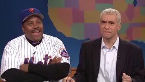 On Saturday Night Live, October 6, 2007 (Season 33, Episode 2), Fred Armisen as Omar Minaya and Kenan Thompson as Willie Randolph take to the Weekend Update desk to unsuccessfully explain away the Mets’ late-season collapse (with Thompson in a home Mets uniform and blue cap).