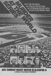 The Oakland Mets (whose uniforms looked more softball than baseball) lost to the California Stars when Ralph Hinkley homered for the California Stars in Season 2, Episode 1 of The Greatest American Hero, “The Two-Hundred-Mile-an-Hour Fast Ball,” November 4, 1981. No, we’re not sure what a team called the “Mets” was doing playing as “Oakland”. We are, however, certain the Mets were nowhere near a World Series in the late ’70s, but a stock photo of a Mets game at Shea Stadium (wide angle, probably from the ballpark’s early days) appears in a TV Guide ad for the March 20, 1977, premiere of the ABC movie Murder at the World Series, which itself filmed its baseball sequences at the Astrodome, as the World Series in question pit the Astros versus the A’s. Maybe somewhere in here was the seed of the idea that became Major League Baseball’s 2020 postseason bubble.