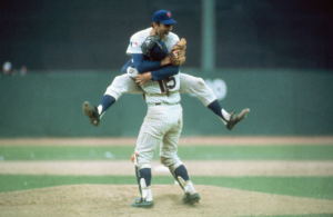 Getting to those 20 wins also shouldn’t have taken so long. Kooz was in his ninth full season then. Maybe an extra win in his freshman campaign of 1968, when he posted a 19-12 record, beyond anything any Met (even Seaver) had ever compiled, would have lifted Kooz over some kid named Johnny Bench for National League Rookie of the Year honors. Maybe perception of a career that awed his teammates and opponents begins to shape differently with just a few more runs scored on his behalf. From 1973 through 1975, Jerry allowed not much more than three earned runs every nine innings and won exactly four more games than he lost. In ’76, he could have captured the Cy Young Award. His start was slower than that of his ultimately successful rival for the hardware, Randy Jones. Jerry finished hot, however: 12-4 in the second half, with an ERA of 1.64. Jerry was always a helluva finisher. Just look at that fifth game of the 1969 World Series. Gave up three runs in the third inning and brushed it and the Birds aside until Game Five ended with Jerry Grote literally catching Jerry Koosman.
