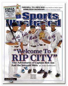 [8]All at once, we were larger than life. It was such a step up from 2005 that I might have asked myself if this wasn’t all happening too soon (especially given that it was the second year of our blog, when I tended to pinch myself that we got to write about this kind of joyride), but then I’d remember twenty years was hardly too soon. So I got back to taking in all our enormity and reveling in it nonstop. Five Mets graced the cover of Sports Illustrated. Six Mets populated the National League All-Stars. Our new television network was a cable TV sensation. Our new ballpark was putting down stakes in Shea’s parking lot. Our Team, Our Time, as our goofy yet zeitgeisty attempt at an anthem [9] put it. When the 1986 Mets swung by Shea in August to celebrate their china anniversary, they could have been forgiven for doing a double-take if they thought they were glimpsing a version of their younger selves. We were in the midst of a seven-game winning streak. We were nursing a 14-game lead. We were days away from swatting dramatic home runs to unnerve the Cardinals. By the end of the month, we’d have the best record in baseball.