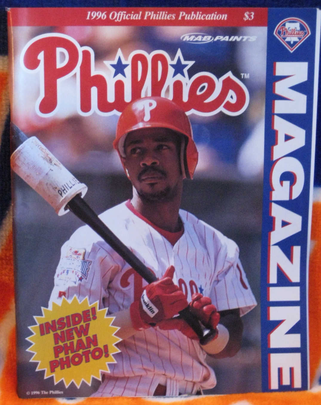 We chose the last Met-Vet series of the season, late September. This time the Mets’ lead over the Phillies was 5 games; sadly, it was the margin between fourth and fifth place in the N.L. East. Neither team was going anywhere but home, yet I still managed to secure lousy seats. Attendance — paid if not physical — was in the 27,000s, perhaps attributable to it being Phan Appreciation Day wherein everybody was handed a random premium that had gone unclaimed over the course of other 1996 promotional dates. We were the proud recipients of a pair of Phillies yearbooks.