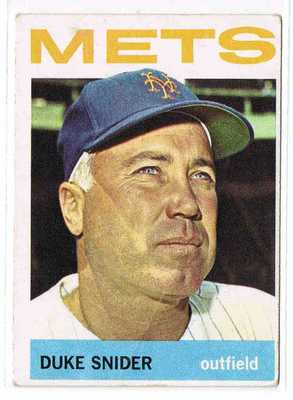 We remember Snider for the memory of him as a Dodger, and for that lone campaign as a Met. His 1964 Mets card captures him perfectly, in oversaturated Topps colors: silver hair, ice-blue eyes, the penetrating gaze and granite chin of a captain of infantry or industry. Yet I’m torn when I think of those old New York players and their victory laps around the Polo Grounds. They bind the Mets more closely to the Dodgers and Giants and Yankees than blue and orange and pinstripes already did, it’s true — and I’ll always be a sucker for mystic chords of memory. But the likes of Hodges and Woodling and Zimmer and Snider and Berra and even Casey himself were brought to New York not because they could help their new club — with the exception of the luckless Roger Craig, they did very little of that — but, as Greg noted earlier, to be sideshows meant to distract the paying customers from how shabby the on-field product was. (This self-defeating nostalgia had an encore with Willie Mays’s farewell tour in 1972 and 1973, but I can forgive Mrs. Payson that one: What’s owning a baseball team for, if not trying to stop time for your favorite player?) The Mets got better when they outgrew serving as a rehearsal for Old Timers Day for the Boys of Summer and their ancient adversaries; in paying homage to the 1950s Dodgers and Giants and Yankees who wound up in orange and blue, we should remember that the franchise’s early days would have been less pathetic with fewer such cameos.