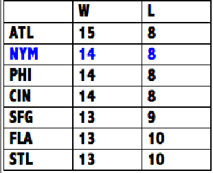 The 1986 and 1988 division winners rolled out to 29-11. They couldn’t main that pace but they didn’t have to. 108-54 and 100-60, respectively, were quite sufficient. Nobody wins 72.5% of 162 games, after all. The 25-15 1985 Mets kept it up as such to get near 100 wins (98), if not close enough to first place in those pre-Wild Card days. At 24-16, the 2006 Mets were on track to wind up with 96 wins; they wound up with 97, gripping first place in the process.