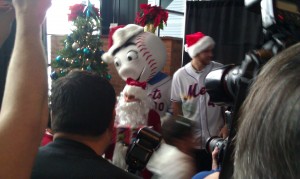 At this year’s holiday party, Daniel Murphy, a fellow whose name has arisen in trade rumors, donned the beard, the hat and the ho-ho-(w)hole get-up. If the swap speculation come to fruition, well, there’s your “curse” at work. If not, we’ll always have the Bensons. Anyway, for the second December in three, Murphy showed his versatility, doing his best to play a representative Father Christmas the way he has worked to succeed in left and at first, third and second. He gave kids gifts and, with the uniform of the day tucked safely in the Hefty, he gave a few of us bloggers answers to a random assortment of inquiries.