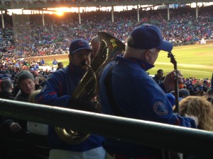 Anyone who wants to consume an enormous quantity of beer in Wrigley but fails is either an invisible mute or pathologically shy — Wrigley has an endless parade of vendors hawking raffles, beer, hot chocolate, beer, hot dogs, beer, beer and (yes) blankets. But it’s a cheerful procession. I got a ringside seat for the Cubs Dixieland Band, and then poked around the other sections of the park while the Cubs were doing inept things out there.