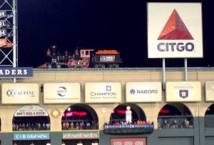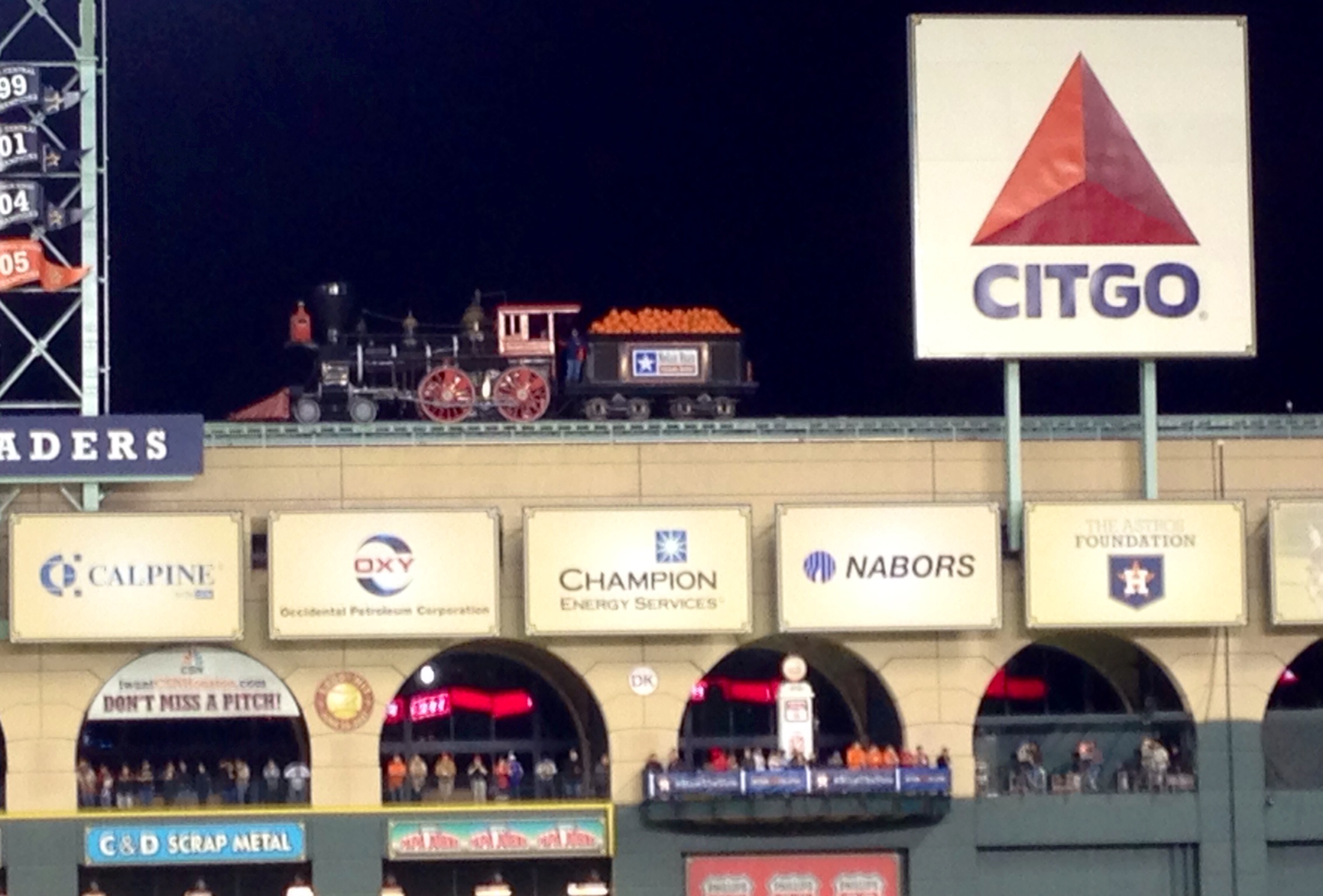 And OK, it was a beautiful night. That makes up for a lot — I saw all four parks on nice days, with the kind of weather that made you perfectly happy to imagine a big comeback, extra innings and more baseball. O.co is a disaster, yes, but it’s got green grass, happy fans and a good baseball team inside. Chase Field is a mall, but I enjoyed chatting with the woman next to me, an old New Yorker who made sardonic sport of the park’s overreach but was there till the end cheering on the home team. Minute Maid Park might be a tad overdone, but it’s friendly and gives you moments of beauty. Like the train silhouetted against the sunset of a perfect Texas night. Or the familiar sights of fielders carving out routes across green grass to intercept fly balls. Or the sight of the home team happily dogpiling after a trudge to defeat turned into a victory lap.