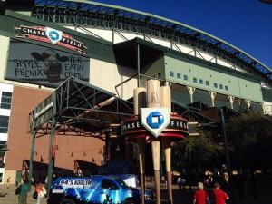 My next stop was Chase Field, home of the Diamondbacks. The D’backs are a deeply weird team, one given to overhauling rosters and philosophies and uniforms at a dizzying pace. They’ve always bugged me on some level — I suspect I’d despise them if I had to see them as often as I do the Marlins. Part of it is the uniforms — the Diamondbacks aren’t quite the sartorial tire fire on display down in Miami, but they make up for it by switching madly between bad ideas: random colors, the stupid snake as D, and the stupider “db” as snake head. I once described their brand identity as “Barfed-Up Pueblo, a dog’s breakfast of vaguely Southwestern motifs run through a blender by a meth-addled dude in a trailer,” and I think that pretty much summed it up.