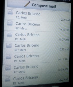 This was Tuesday afternoon. By Friday morning, it was my turn to help him kill time. Chuck was getting his oil changed, so he reached out to me. Much of our interaction over the past decade has come while Chuck is taking care of an errand. When I hear from him, I usually also hear a loudspeaker voice instructing him to drive around, his order is ready. In this case, he chose to e-mail instead of call. The result was a rapid-fire exchange that filled up my phone’s screen with a stream of messages titled “RE: Mets”.