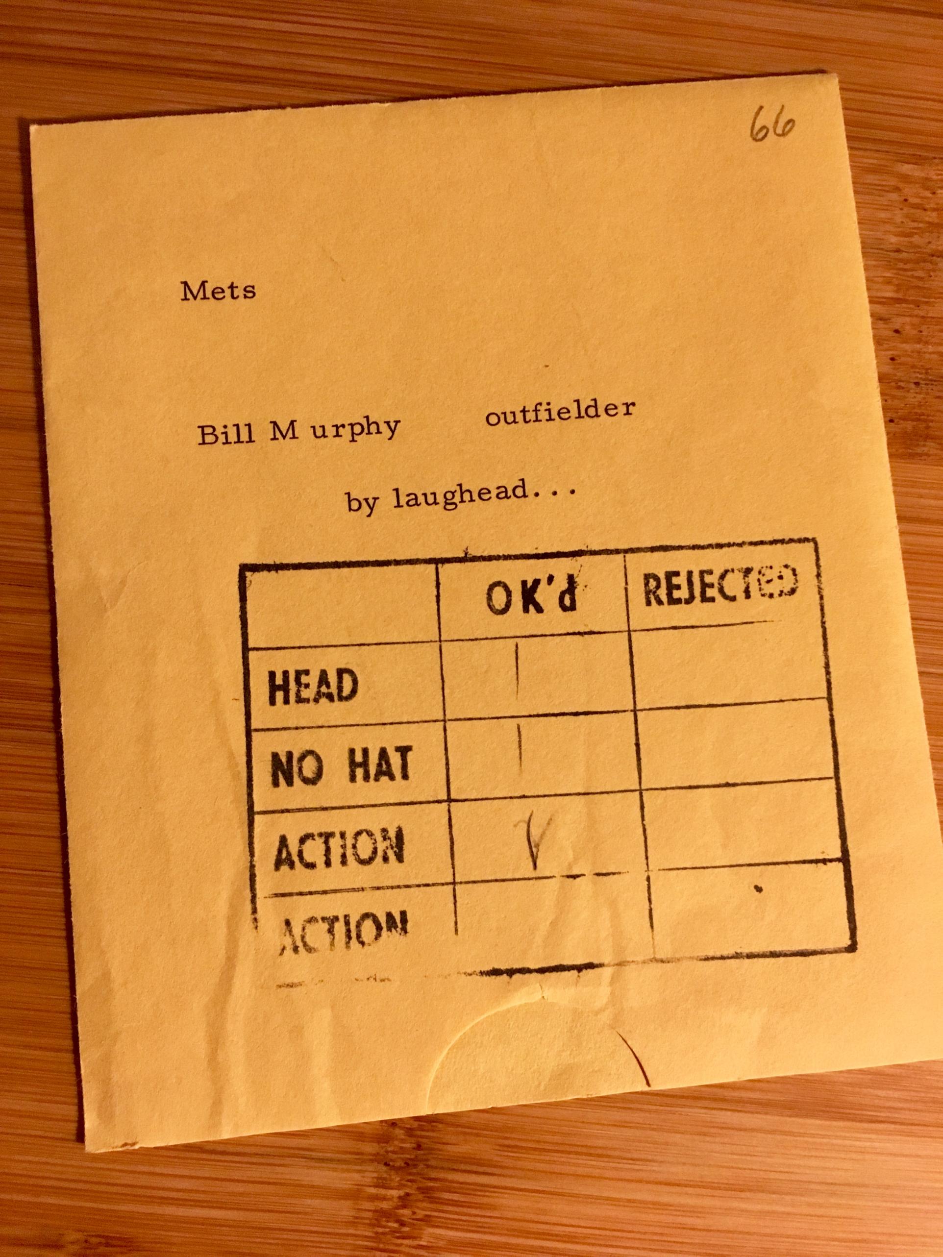 I won the latter, and it came with a fun bonus: the half-envelope Topps had used in its filing system. It tells us that Topps had (in this folder at least) three Murphy shots: one each of Head, No Hat and Action. I wonder if the action shot was the one used for his 1966 card — if so, the slide would have been physically cut down to fit the space. That half-envelope also gives us the name of the photographer: Jim Laughead, a legend who essentially invented the basics of sports photography. (Laughead called his standard football poses “the huck ‘n’ buck.”)