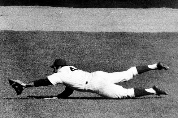 Staub was my favorite player, though of course I loved Seaver, rooted for Harrelson and appreciated Kranepool. But as a newly minted Mets fan with a dorky, proto-blogger’s bent, I hungered for history. Desperate to know what I’d missed, I inhaled books about my team — if the Emma S. Clark Memorial Library had a quickie book about the ’69 or ’73 team (or any other year), I read it and then immediately wanted to read it again. With DVDs and online video yet to arrive, I got most of my postseason lore from the written word and static pictures, from descriptions and reminiscences and snapshots and sportswriters’ flights of fancy. Tommie Agee in awkward mid-stride, a plume of white at the end of his arm. The unhurried way Gil Hodges strolled from the dugout to visit Lou DiMuro with a baseball in one big hand. Tug McGraw dodging and diving and weaving and bulling his way to the dugout. Willie Mays on his knees in vain supplication. Koosman jackknifed in Grote’s arms, with Ed Charles in the early stages of liftoff nearby. And, of course, Ron Swoboda — fully outstretched and parallel to the right-field grass, approaching an uncertain intersection with the ground and a baseball.
