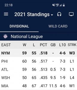 We did sweep the Nationals last week, and the games definitely counted in the standings. For a literal minute on Friday night, after the Phillies lost and while neither the Mets nor Braves had completed their appointed rounds, we were in first place by a single percentage point. “Look who’s No. 1!” a friend tweeted in my direction a little before 10:30. It was his homage to the Shea scoreboard from the second the Mets first took first place on September 10, 1969, the Mets nosing ahead of the Cubs by .001. That transcendent tick of the clock from 52 years ago was only the beginning of a first-place stay that never ended. The dizzying interval achieved after the Nationals series ended with the Dodgers beating us once. By the time L.A. beat us thrice, first place was falling out of easy reach. The Giants (along with the Braves) have batted away it even further.