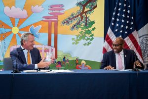 • On September 20, 2021, to welcome Mayor Bill de Blasio — who played himself on TV for eight years — to Queens Borough Hall for hizzoner’s week of conducting the city’s business from Queens, borough president Donovan Richards presented de Blasio with “a little mascot [of] the New York Mets. We hope to continue to try to convert you,” which the mayor accepted graciously: “Yeah, this is cool. This could do it right here.” The Red Sox-rooting mayor kept the miniature Mr. Met by his microphone for his further media appearances at Borough Hall. (A montage of Queens scenes behind him included a Mets logo with the message LET’S GO METS!!!!!)