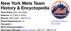 When Fried and Pillar and Acuña and Olson and the rain conspired to defeat the Mets, it knocked us 333 games below .500. Not for this year, but for all years. Our current lifetime record of 4,667-5,000 —— plus 8 ties — carries a lifetime winning percentage of .483. For context, if you apply .483 to a 162-game season, you’d have a team that goes roughly 78-84 every year for nearly 60 seasons. The Mets are in their 62nd season, but a few of them have been shortened by strikes and pandemics and whatnot. The Mets have never posted a 78-84 record at year’s end. The closest they’ve come is 77-85 in 2011, 2018 and 2021; 77-84 in 1991; and 79-83 in 2010 and 2014.