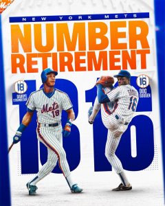 I have to commend Steve Cohen and the Mets organization for doing this, as it would have been far easier not to; to just say that Darryl and Doc were great but didn’t last long enough as Mets and/or had too many off-field issues to have their numbers retired. But Cohen and his team have shown a keen understanding of the history of this franchise and the unbreakable bonds of its players and broadcasters with its fans. The Hall of Fame selections and the Old-Timers Day event ( which I did not get to watch live last year, as it coincided with our son’s wedding, but which I finally caught during a rain delay a few weeks ago) and the populating of the left-field rafters bear witness to this. 16 and 18 belong there. Long may they stand!