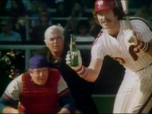 I flashed back more than forty years to my disdain of another successful Phillies unit, the Phillies who came close to winning it all in the late 1970s and would win it all in 1980. The Mike Schmidt Phillies, in other words. Those Phillies won division titles when there were no Wild Cards. Those Phillies won season series from the Mets without sweat. Schmidt was a big enough deal to co-star in a commercial for a carbonated soft drink (back when commercials featured active baseball players more than they did retired ones), positively glowing at home plate like Schwarber in 2023, also overshadowing the ineffectual catcher in his midst. Schmidt, resplendent in red pinstripes, informed the public he was Turning 7 Up by tapping home plate and having a bottle of the sponsor’s product pop up from the ground, with the forlorn visiting-team catcher crouching haplessly as he realized not only was his pitcher probably not gonna get Schmitty out, but this bastard in the box was gonna be refreshed as he rounded the bases.