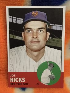 Hicks was called up to the Mets from Buffalo shortly after the All-Star break in 1963. The Mets finished the first half on a ten-game losing streak and began the second half by losing five more. All help was welcome. All help began to make a difference on July 15 when, in Hicks’s third start as a Met, Joe doubles in a run in his first at-bat. Two batters later, pitcher Carl Willey launches a grand slam. Hicks will also single a run home in the fourth and single once more besides. Three hits, two runs, and the Mets are 14-5 winners over the Colt .45s in the opener of a doubleheader at home. Losing streak over. Hot streak begun.