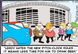 On October 23, 2023, in the single-panel comic strip The Lockhorns, Loretta Lockhorn informs another couple that grumpy-looking Leroy Lockhorn “hates the new pitch-clock rules…it means less time for him to drink beer,” and she does so in the parking lot of a gray edifice that is very much modeled on the dear departed Shea Stadium, a mere fifteen years since it last hosted a ballgame.
