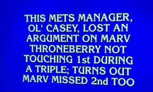 • On the April 14, 2023, episode of Jeopardy, the following clue was offered: “This Mets manager, Ol’ Casey, lost an argument on Marv Throneberry not touching 1st during a triple; turns out Marv missed 2nd too.”