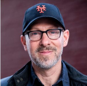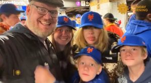 —Comedian Jim Gaffigan’s Father’s Day essay on CBS Sunday Morning, June 18, 2023, illustrating his own dad life with a picture of himself with his children all in Mets caps at what appears to be the Grand Central 7 station, presumably going to or coming from a Mets game (Gaffigan is smiling; the kids are…not quite).
