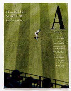 A distant shot of Mark Canha playing left field at Citi Field graces the cover of the July/August 2023 issue of The Atlantic, illustrating Mark Leibovich’s cover story, “Moneyball Broke Baseball,” about the implementation of the pitch clock.