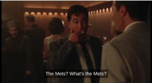 • And on Hulu’s How I Met Your Father, Season 2, Episode 13 (2023), Sophie may have spotted her father in the hot dog shop, watching a ballgame and cheering “Let’s Go Mets!” sparking an epiphany on Sophie’s part that she knows so little about the man who might be her father, thus scaring her off from confronting him with the possibility that they are indeed father and daughter. Another character says, regarding the man’s Mets fandom and the possible family ties, “That’s a brutal legacy to live with.” Come Episode 18, as she has dinner with the parents who supposedly haven’t seen each other since conceiving her. Sophie, in an effort to make her Mets fan father happy, asks the harpist she’s hired if she knows any songs about the Mets. ”I went to Juilliard,” is the harpist’s response.