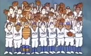In the 2001 time-travel romcom “Kate and Leopold,” the actor brother of Meg Ryan’s character (Kate McKay) is watching a Mets game, with Mike Piazza at bat. The brother, Charlie, played by Breckin Meyer, starts calling the action using different accents. When Mike hits a home run, the brother describes it in an Indian accent similar to that of Apu from The Simpsons (itself considered culturally insensitive in later years, even if it is a creation of celebrity Mets fan Hank Azaria…and Apu’s favorite squadron is the Nygh Mets). In addition to game footage, the moviegoing audience was treated to a glimpse of a framed poster featuring the Mets skyline logo and several of the 1969 Mets — their heads floating in circles — above the words LET’S GO METS as it appeared in the apartment of Liev Schreiber’s character (Stuart Besser, Kate’s ex).