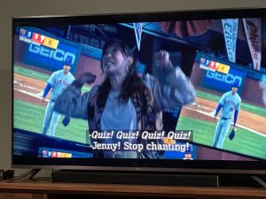 In Quiz Lady (2023), Jenny (Sandra Oh) wants a Philadelphia bar to switch its TVs away from the Mets and Phillies to the game show her sister Anne (real life Mets fan Awkwafina) watches regularly, a program called Can’t Stop the Quiz. In the televisions in the background of the scene, Taijuan Walker is pitching for the Mets at Citizens Bank Park with a 3-0 lead on April 11, 2022.