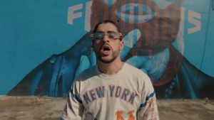 In the video for the Arcángel and Bad Bunny single “La Jumpa,” released in late 2022, Bad Bunny makes several appearances in a highly detailed long-sleeved shirt celebrating the Mets. The franchise’s home ballparks and world champions appear listed on the respective sleeves while NEW YORK and NY are prominent on the front.
