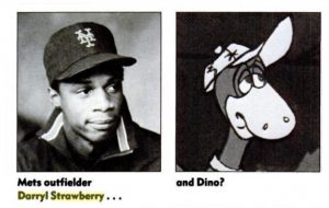 Before the Strawman was in need of the a second chance, the December 1987 issue of Spy magazine, splashed its popular “Separated at Birth” feature on its cover, with two subjects suggested as sharing DNA Darryl Strawberry (in Mets cap and jacket) and Dino from the Flintstones (in a non-team baseball cap). The resemblance was striking.