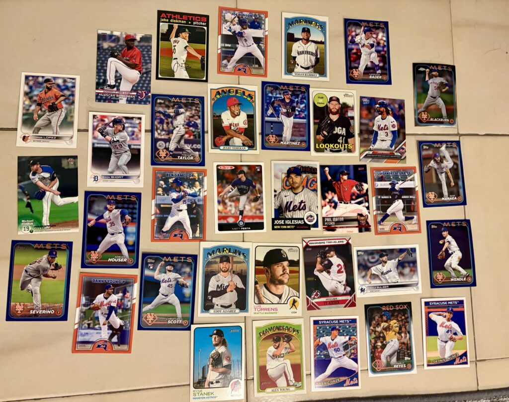 Ben Gamel: A journeyman outfielder known to Stearns from a stint as a Brewer, Gamel spent a month and a half on the roster, mostly as a defensive replacement late in games, and did nothing particularly praiseworthy or blameworthy. 2024 Syracuse Mets card; he has not one but two unique cards from Topps team sets, which were expensive and annoying to track down. This isn’t Gamel’s fault but I’m still a little ticked.